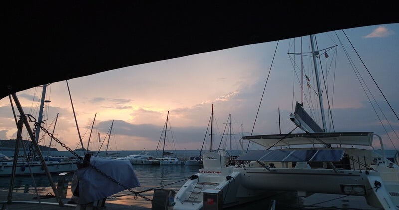 Dan is het zover; tijd om de oversteek naar Sicillië te maken. We zijn om 07:00 uur vertrokken en het was een rustige vaartocht van 9 uur. Om 14:00 uur zagen we boven het eiland Sicillië donkere wolken verschijnen en in de verte zag je het regenen. Gelukkig was het op zee redelijk heldere lucht en de regen voor ons bleef uit. Bij aankomst van onze haven hebben we de dieseltank volgetankt. Daarna werden we begeleidt naar onze winterplek maar daar lag nog een boot. Later hoorden we dat de eigenaar zijn boot niet had weggehaald terwijl zijn contract was verlopen. We liggen nu 4 plaatsen verder en wachten dat de boot wordt opgehaald. In ieder geval moet hij de 15e weg zijn want dan is deze plek van ons. Het is een mooie nieuwe haven met aan de kade goede restaurants, terrassen, een Spar en vele winkeltjes. We hebben vanavond heerlijk gegeten bij Gugliotta Gourmet. Na het dessert begon het vreselijk te regen en te onweren. Leuk gezicht dat iedereen naar binnen renden of buiten onder het afdak stonden te wachten. Wij ook maar de regen hield aan en wij zijn maar naar de boot gerend. Aangekomen bij de boot was het droog ;-)